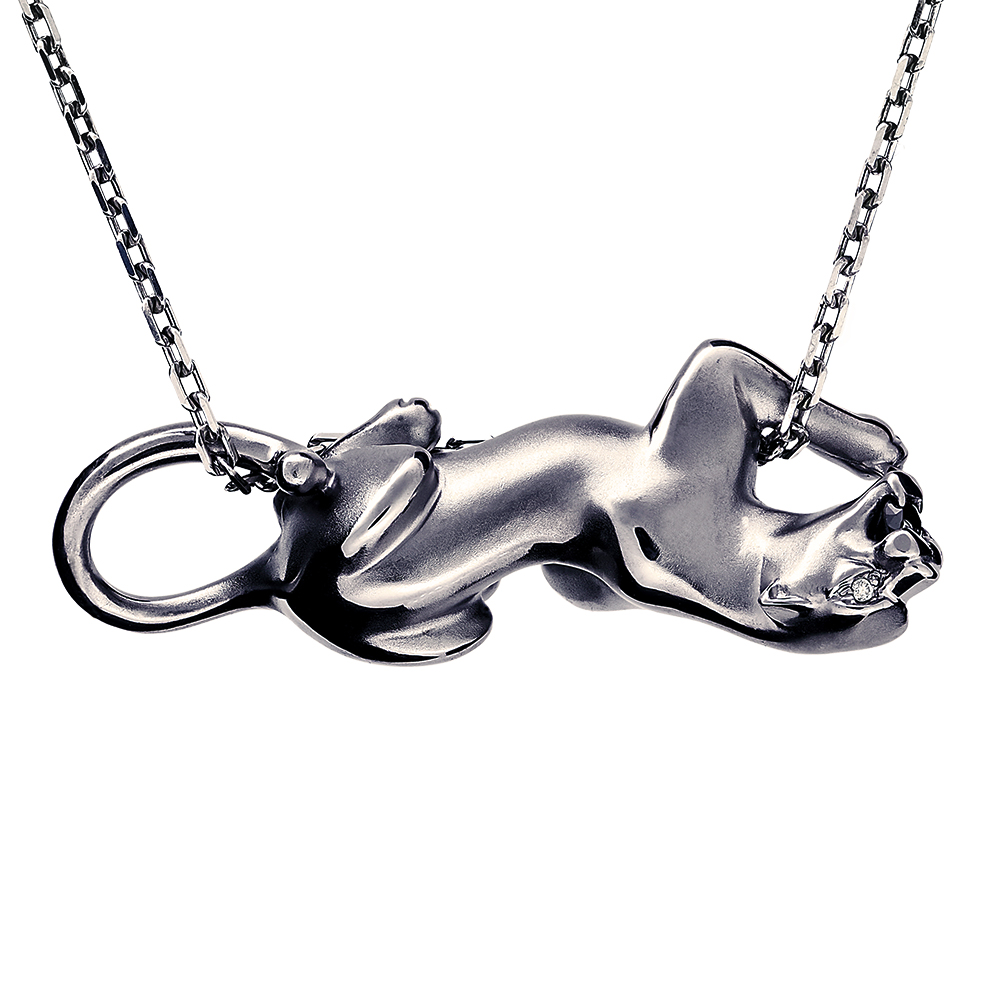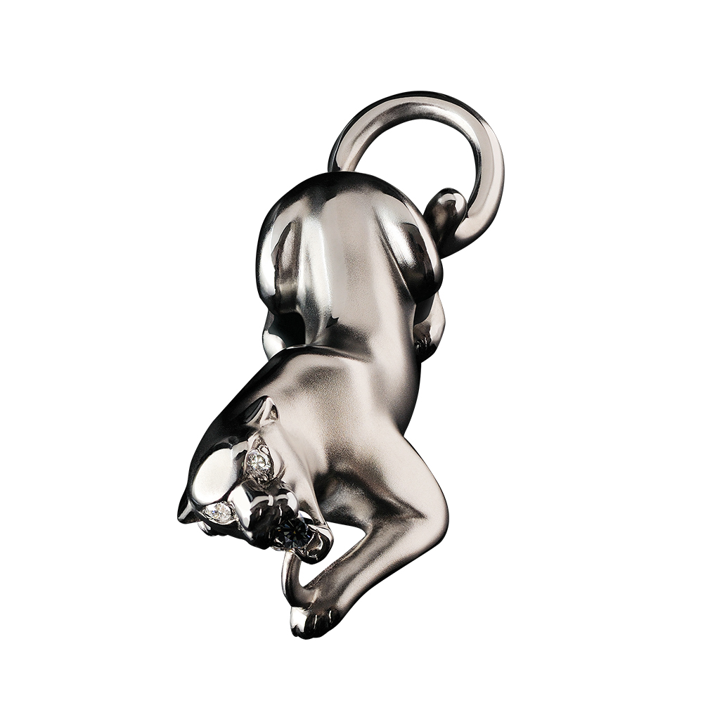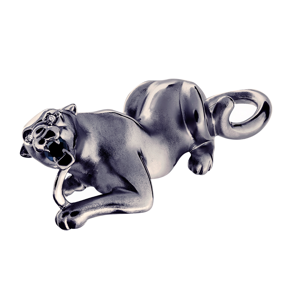 Подвеска "Пантера" выполненная из серебра 925 пробы, покрытие черный родий. В подвеске использованы 3 бриллианта: черный бриллиант каратной массой 0.075 и 2 прозрачных бриллианта общей каратной массой 0.01. Значение веса в характеристиках является примерным и может отличаться от фактического. Точный вес изделия указан на фирменной бирке.