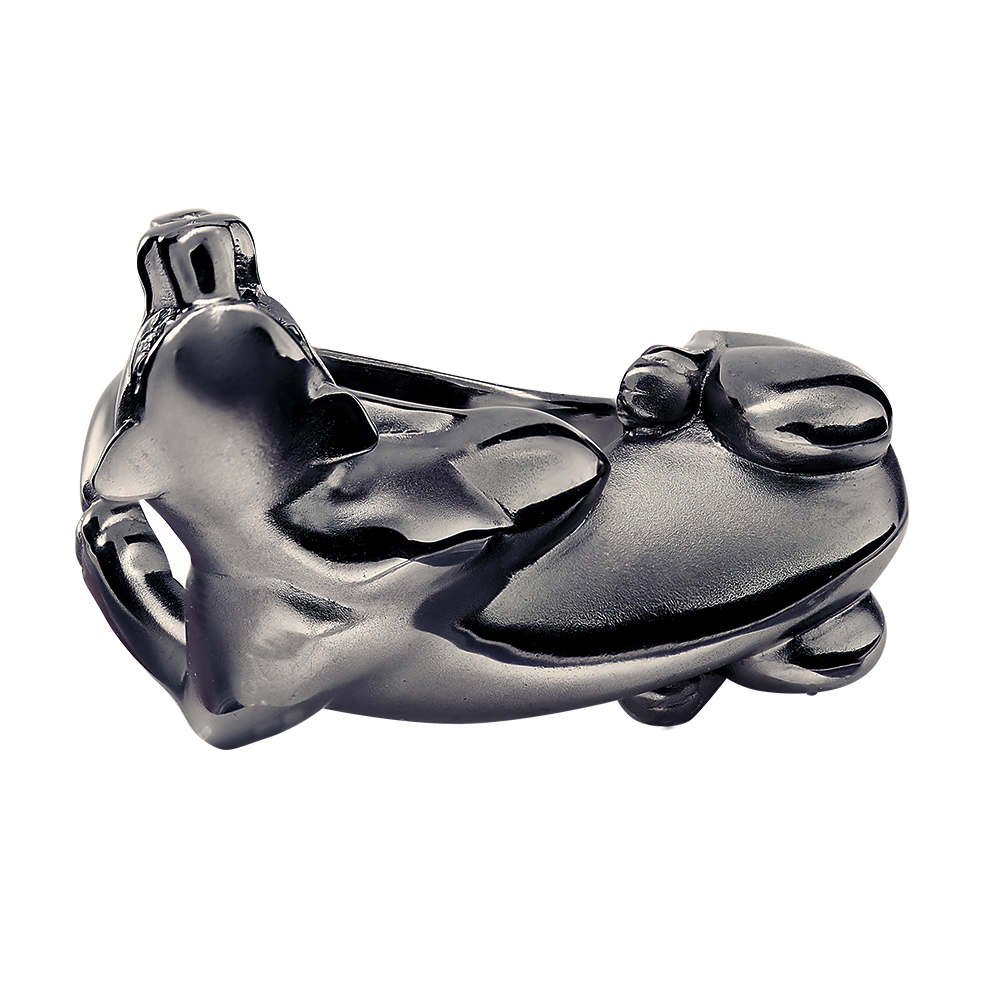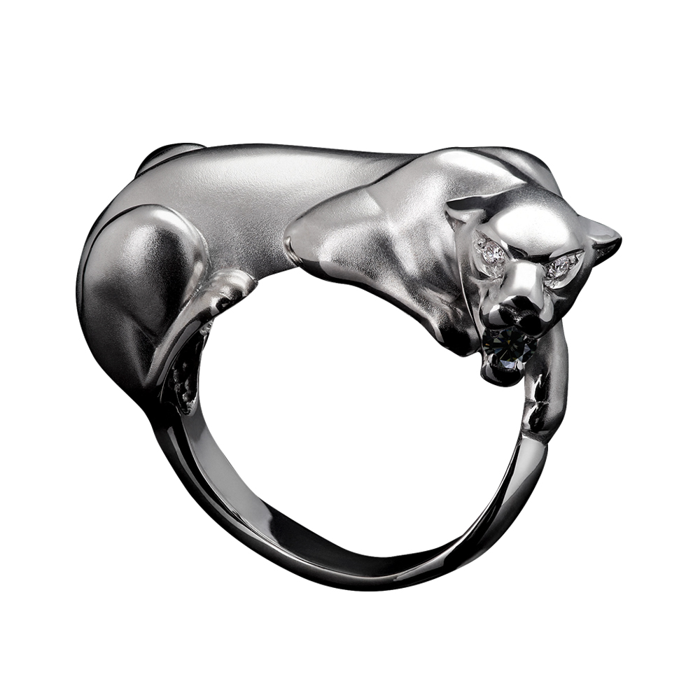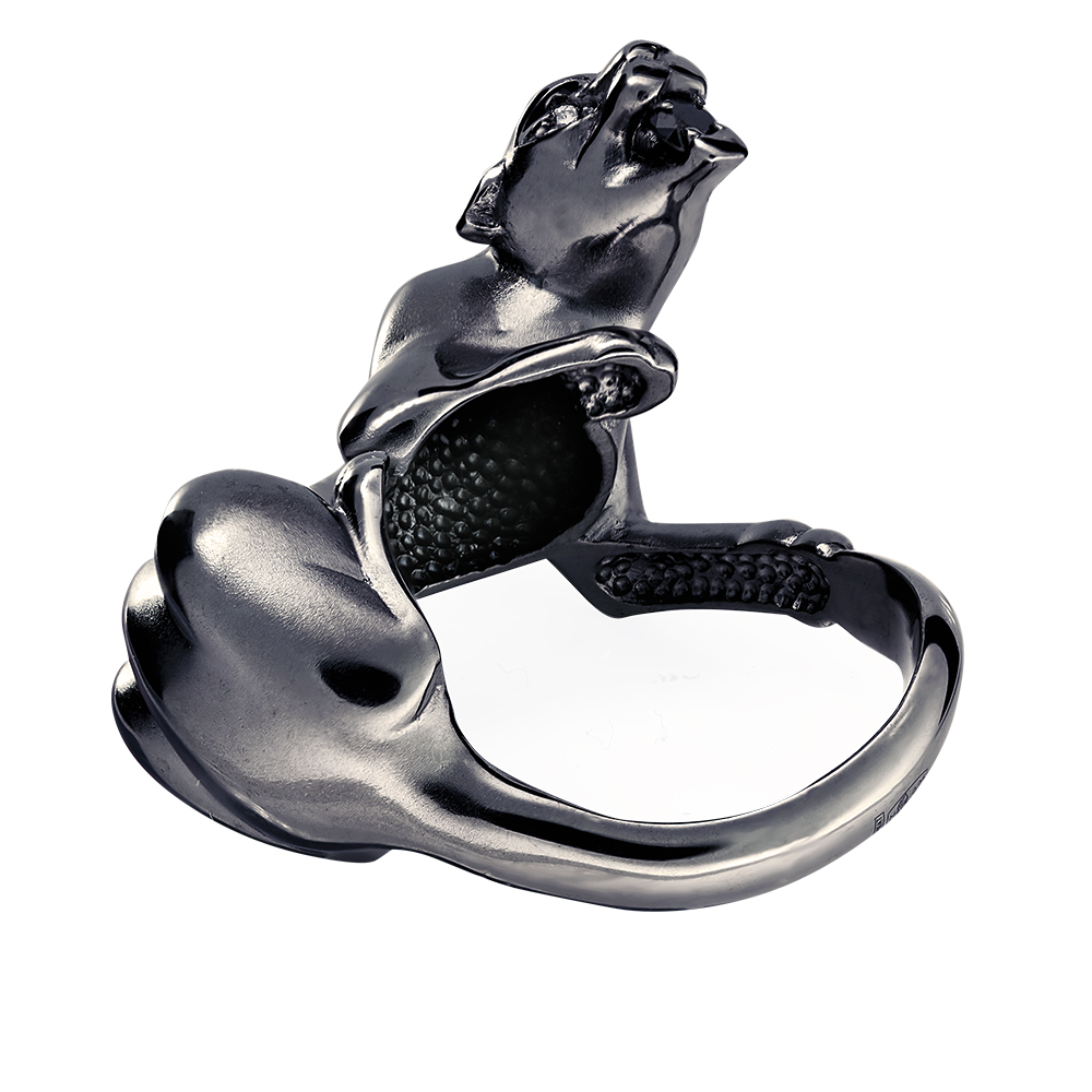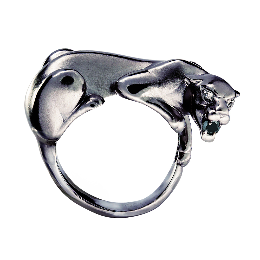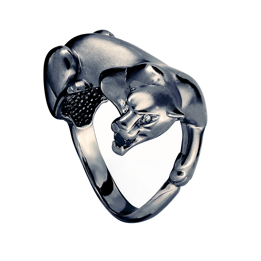 Кольцо "Пантера" выполненная из серебра 925 пробы, покрытие черный родий. В кольце присутствуют 3 бриллианта: черный бриллиант каратной массой 0.075 и 2 прозрачных бриллианта общей каратной массой 0.01. Значение веса в характеристиках является примерным и может отличаться от фактического. Точный вес изделия указан на фирменной бирке.
